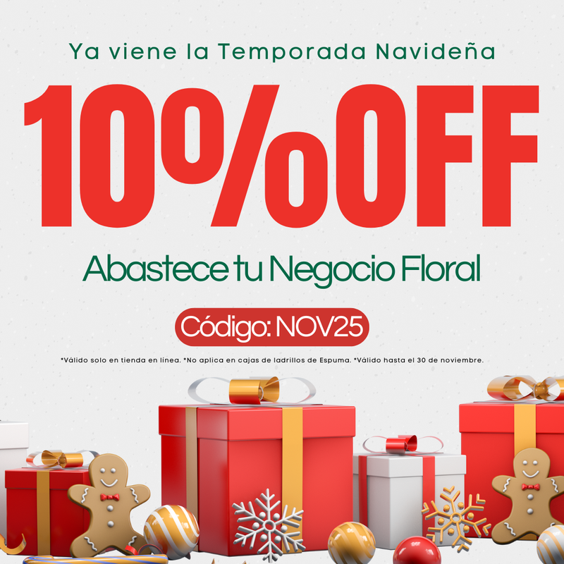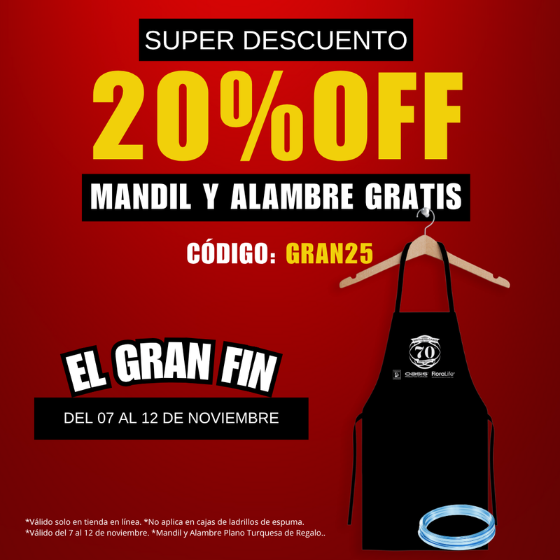 Obtén un 20% de descuento en toda la tienda (excepto cajas de espuma) + MANDIL OASIS® y ALAMBRE plano color turquesa de REGALO usando el cupón GRAN25 . *Válido del 07 al 12 de noviembre de 2025. *Válido sólo en tienda en línea. *Promocionales hasta agotar existencias.
