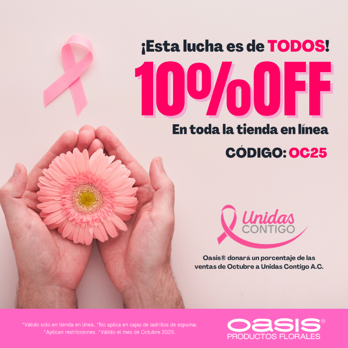 Con tu compra OASIS® Productos Florales donara un porcentaje a la asociación Unidas Contigo A.C. Utiliza el cupón OC25 y obtén un 10% de descuento en toda la tienda excepto cajas de espuma. Válido el mes de octubre de 2025. *Válido solo en tienda en línea.