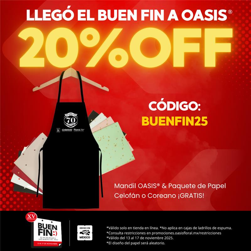 Utiliza el cupón BUENFIN25 y obtén un 20% de descuento + mandil OASIS® y un paquete de papel celofán o coreano GRATIS (seleccionado aleatoriamente) hasta agotar existencias. *No aplica en cajas de espuma. *Válido del 13 al 17 de noviembre de 2025. *Promoción válida sólo en tienda en línea.