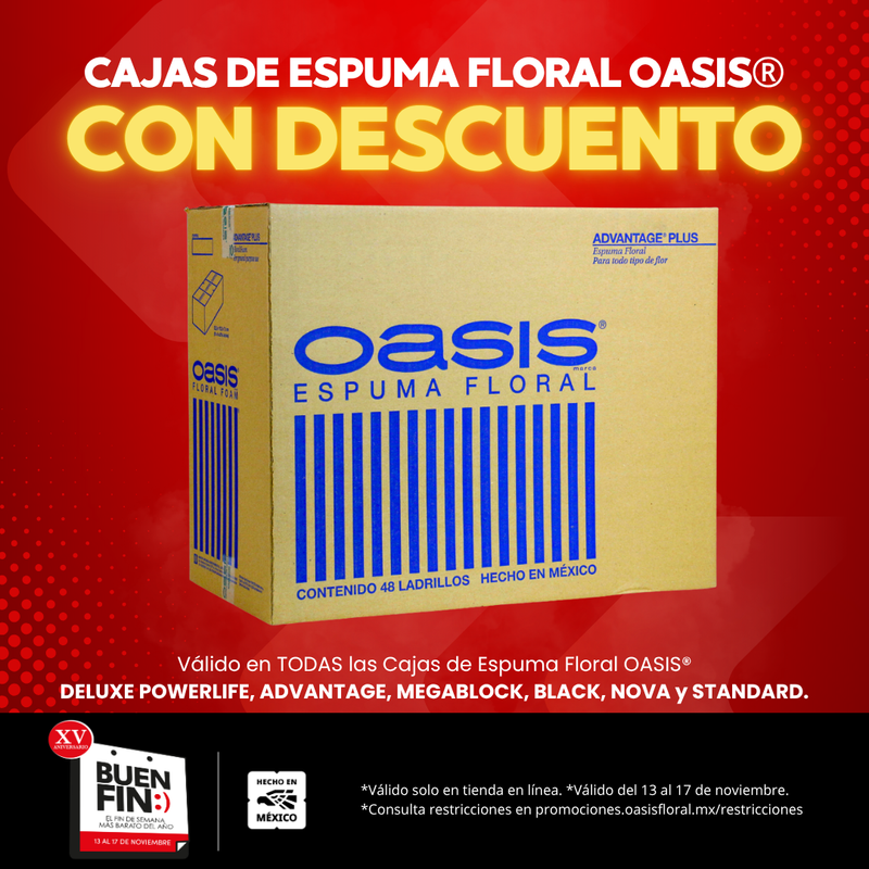 Todas las cajas de espuma floral OASIS® con descuento directo ya aplicado (DELUXE, ADVANTAGE, NOVA, POWERLIFE, MAXLIFE, MEGABLOCK, STANDARD). *Únicamente válido en tienda en línea. *Válido del 13 al 17 de noviembre de 2025.